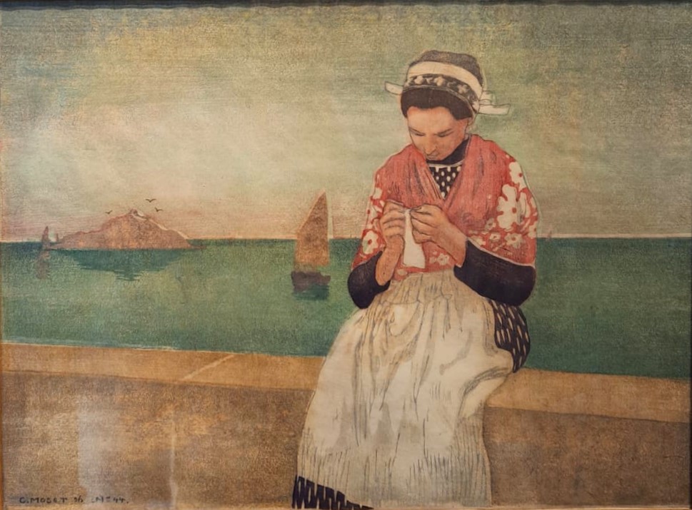 Bild: Carl Moser – Strickende – Farblithografie – 1936